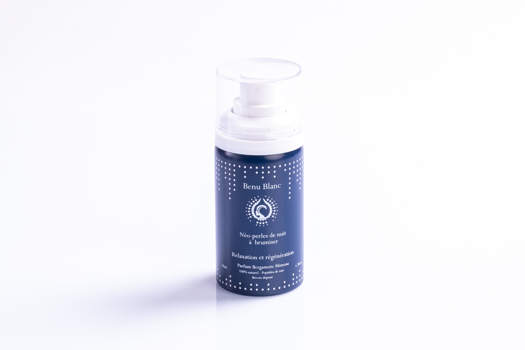 Les Brumes de soins Benu Blanc sont à vaporiser chaque soir sur la taie d’oreiller en soie. Elles permettent de mieux dormir, de lutter contre les troubles du sommeil.